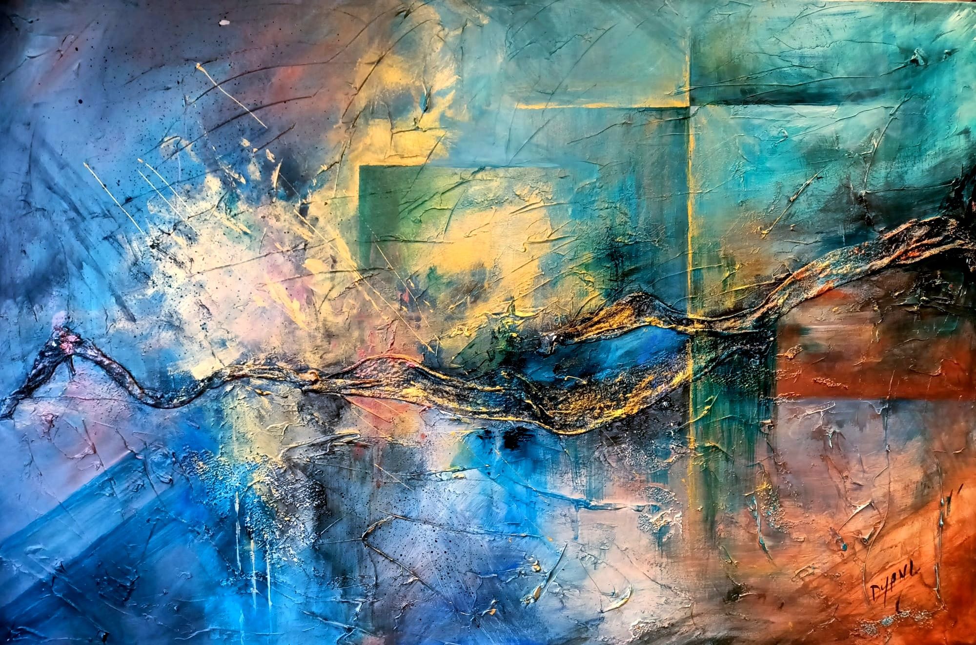 Learn MoreMixed media on canvas, with gold highlights Soft, flowing textures and shimmering gold details bring this ocean-inspired abstract to life. A poetic interplay of blues, turquoise, and hints of violet suggests deep waters and hidden dreams beneath the surface.