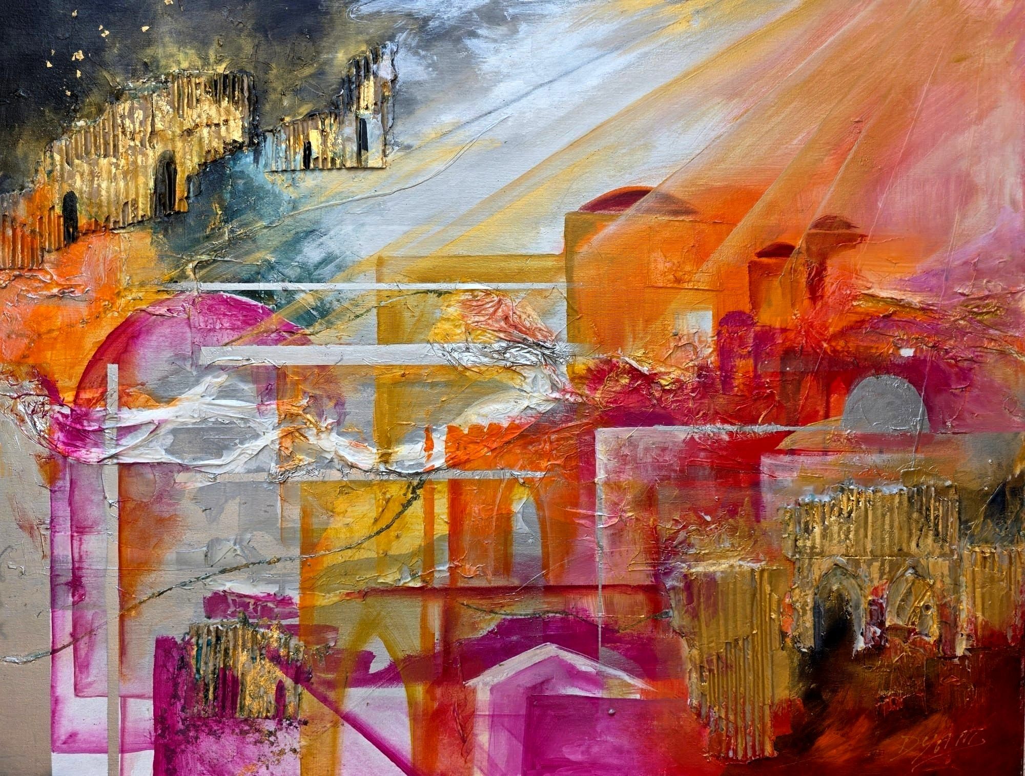 Learn MoreA powerful abstract painting in a range of pinks, crimson, and silver tones, rich in texture and emotion. Energetic bursts of color emerge from the center, evoking movement and light over a subtle impression of Jerusalem in the background. Painted on canvas.