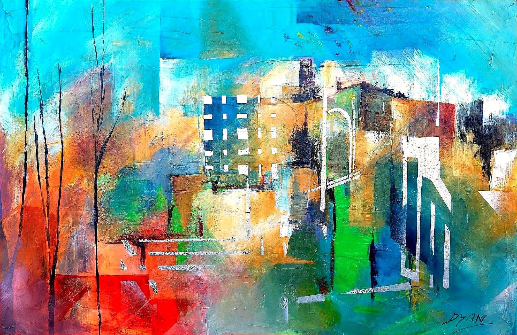 Learn MoreA dynamic cityscape bathed in vibrant blues, oranges and yellows. Sharp contrasts and layered textures evoke a glowing skyline reflected in water, an abstract vision of urban energy and tranquility.